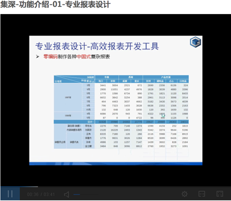 在集深-功能介绍-专业报表设计视频中,主要介绍了集力数据系统中所提供的专业报表设计器,其人性化的设计理念及方便实用的功能,以及通过复杂报表设计器可以实现的各类复杂报表,方便大家直观了解集力数据系统的零编码进行复杂报表设计及展现效果。