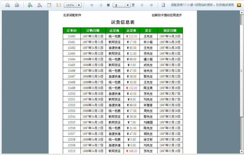 此报表保存为“运货信息表4”,预览效果如下图所示: