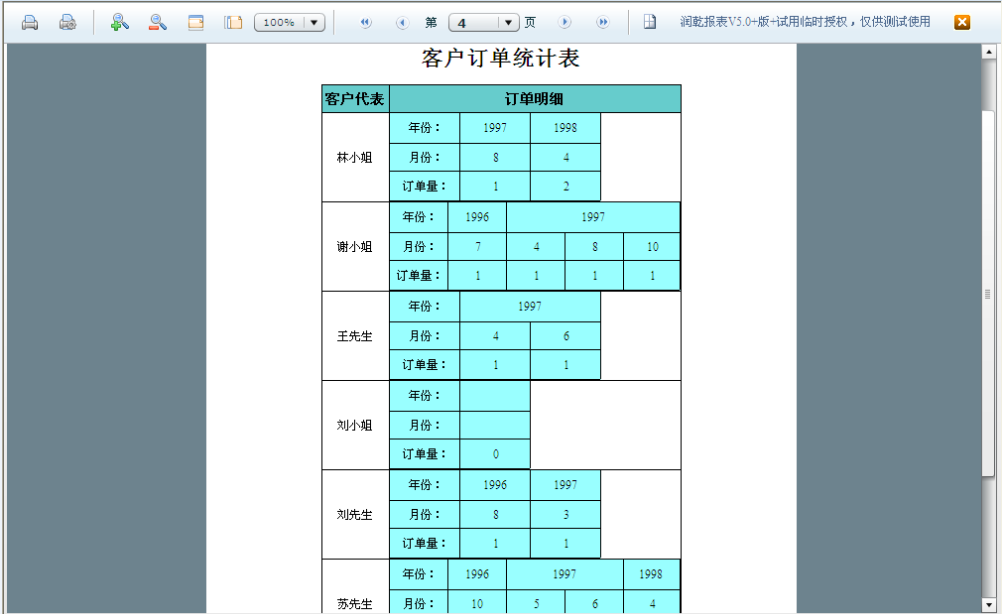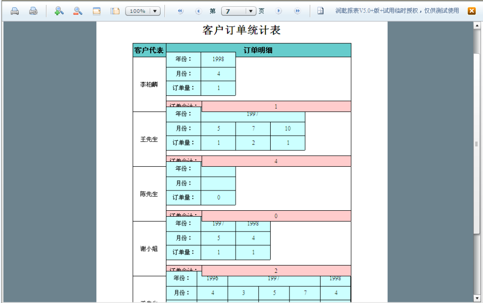 嵌入式主子报表“客户订单统计表2”的预览效果如下图所示: