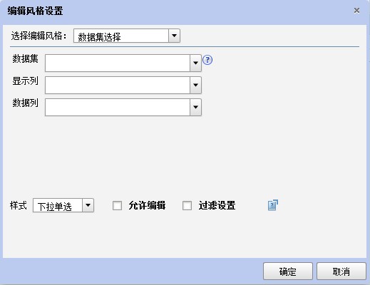 这里为用户提供了输入框、下拉列表框、下拉数据集、布尔值、下拉日历、下拉树六种编辑风格,下面进行逐一介绍: