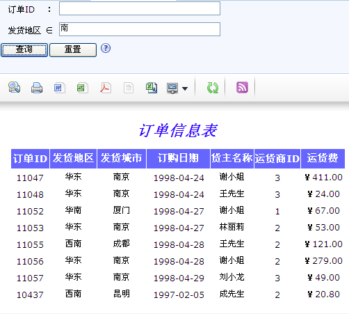 查询时会将所有符合发货地区或发货城市包含“南”的数据筛选出来。