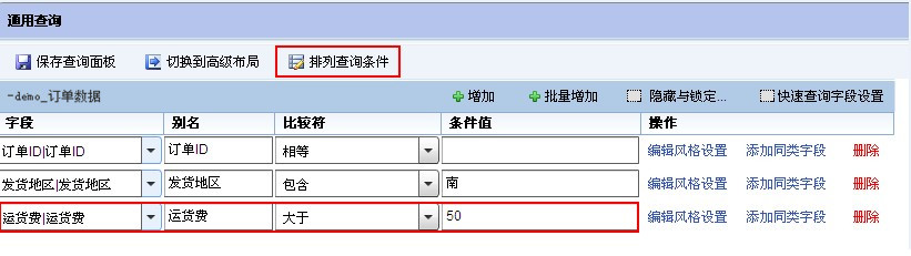 设置了多个查询条件时,系统默认情况下多条查询条件以左对齐的方式,每行显示一条查询条件,用户可以切换到排列查询条件面板,用鼠标拖拽的方式排列各查询条件的布局。