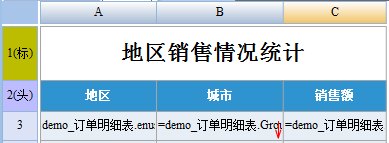 (2)B3单元格表达式:=demo_订单明细表.Group(地区,false)