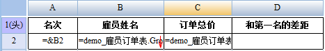 (2)B2单元格的表达式为:=demo_雇员订单表.Group(销售人员,false,,,demo_雇员订单表.sum(数量*单价),true)