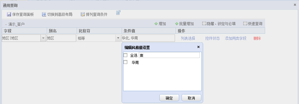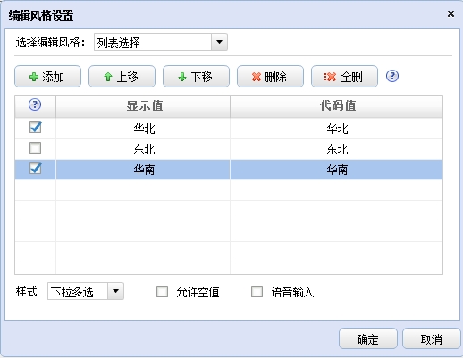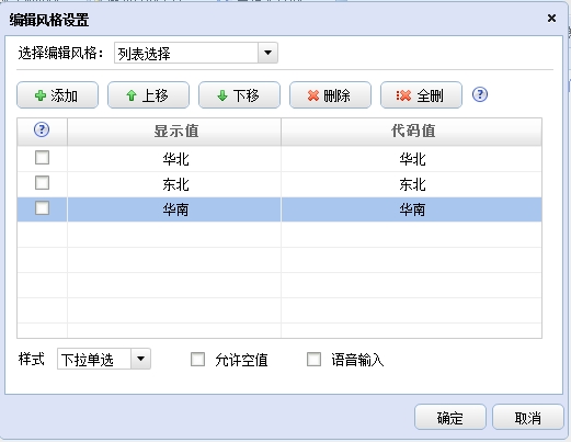 例如:查询字段为地区,设置的下拉列表编辑风格的显示值和代码值如下: