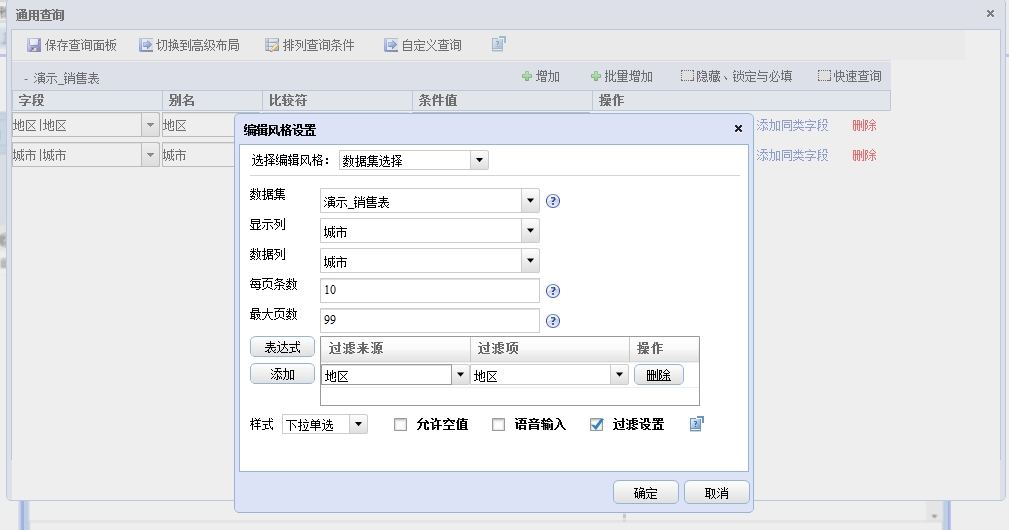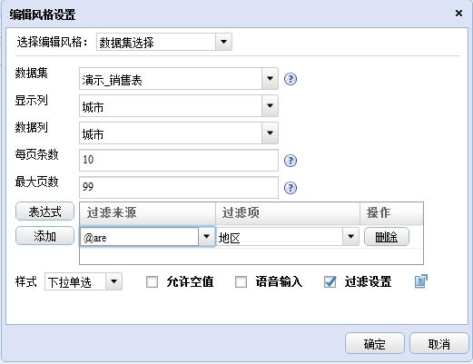 数据集选择编辑风格也可以使用关联过滤功能。勾选【关联过滤】复选框,便可以设置与当前字段相关联的字段和过滤条件。