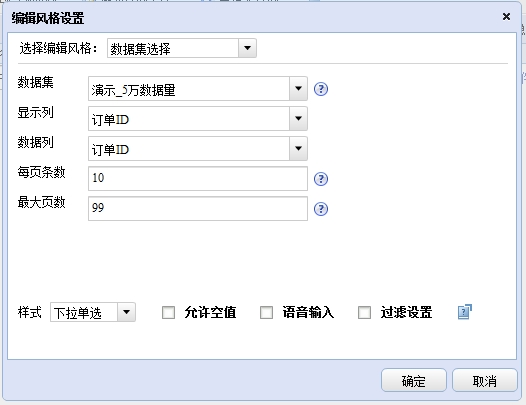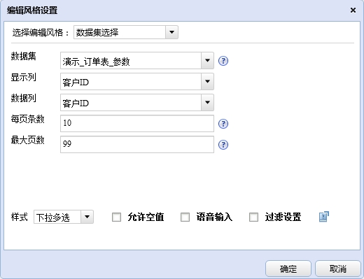 当下拉选项的数据不需要手动输入而是来源于一个数据集时,可对该字段设置下拉数据集的编辑风格。系统将数据从配置好的数据集、显示列、数据列中取出,然后以下拉列表的形式列出,当对该字段设置条件值时,条件值输入框中自动下拉列出该字段所有可选的数据。数据集选择风格的样式选择有六种:下拉单选、下拉多选、单选钮、复选框、色块单选、色块复选。具体设置方式如下: