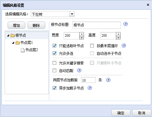 5、回到根节点,用户可设置根节点的标题(如果不设,则系统默认为“根节点”)、下拉框的高度和宽度、是否只选取叶子节点、是否允许多选。