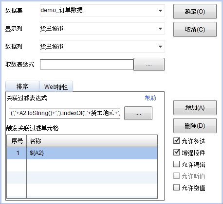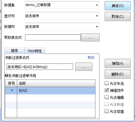 关联过滤表达式:货主地区=${A2}.toString(),表示该下拉菜单中列举的货主城市对应的货主地区必须与A2单元格选择的地区名称一致。而地区名称是通过A2单元格设置的,所以将A2单元格设置为关联过滤单元格。