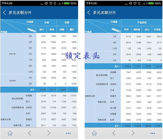 设置了锁定表头的报表在移动设备上展现时具有表头固定的同时可以滚动查看表体内容的效果。