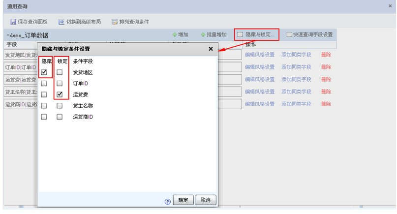 点击 在弹出的对话框中勾选需要隐藏的条件字段和需要锁定的条件字段,【确定】生效。