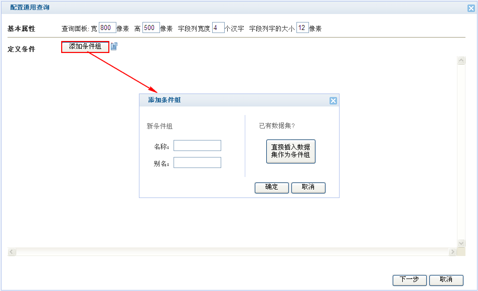 在“添加条件组”页面可以设置基本属性。基本属性用于设置排列查询条件和查看面板的宽度、高度、查询条件名称的显示长度、查询条件名称的字体大小。添加条件的方式有两种,一种是将现有数据集直接作为条件组使用,另一种是自定义条件组,无论使用那种方式都可以添加多个条件组。