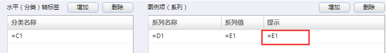 分类、系列的数据设置,既可以直接填写固定值来实现,如下图;也可以直接调用有扩展数据的单元格来实现。