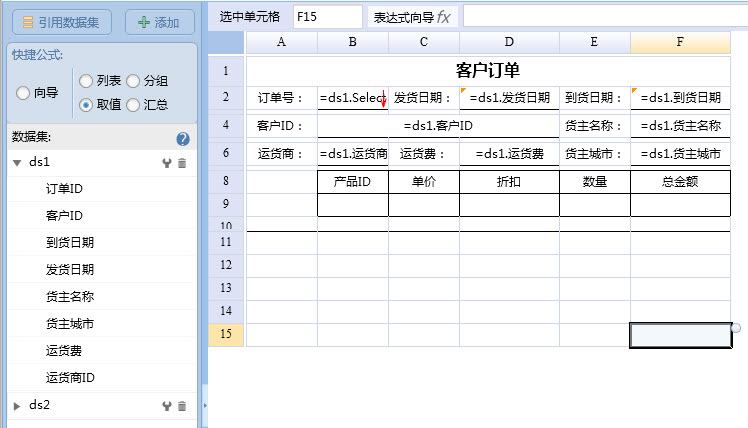 设置主表部分的单元格表达式,选择单元格快捷公式中的“列表”,将数据集ds1中的字段“订单ID”拖入B2单元格,然后再选择快捷公式中的“取值”,将数据集ds1中的其余字段分别拖入主表其它对应的单元格中,例如拖入字段“发货日期”到D2,拖入字段“客户ID”到B4: