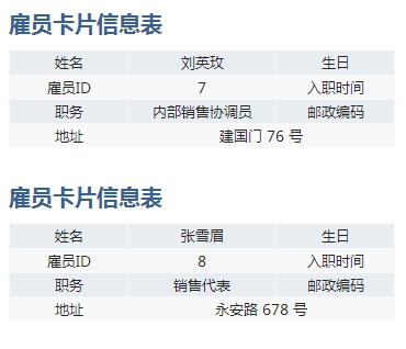 除了遵循默认的主格认定规则,我们也可以人为的设置改变单元格的主格,从而实现灵活的报表扩展方式。例如上面的示例报表中,A1-A6单元格左边都没有纵向扩展格,因此其左主格缺省为`0 格。然后我们通过对B2设置跟随扩展格,使得A1-A6这些单元格被人为设置了左主格为B2,让这些格子都跟随B2格的雇员ID进行纵向扩展,所以就形成了按照每个雇员ID号都能扩展出一片自由格式的报表效果,最终形成了示例中的卡片式报表。