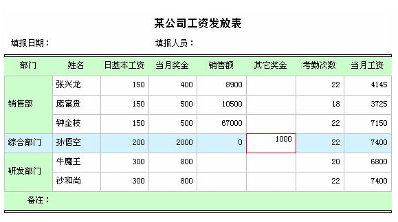 本表达式的意思是,当A6格扩展出来的值为0001时,当月工资计算公式是日基本工资×考勤次数+当月奖金+销售额×0.05,当A6格扩展出来的当前值是0002时,当月工资计算公式是日基本工资×考勤次数+当月奖金+其它奖金,默认情况下返回日基本工资×考勤次+当月奖金。运行情况如图